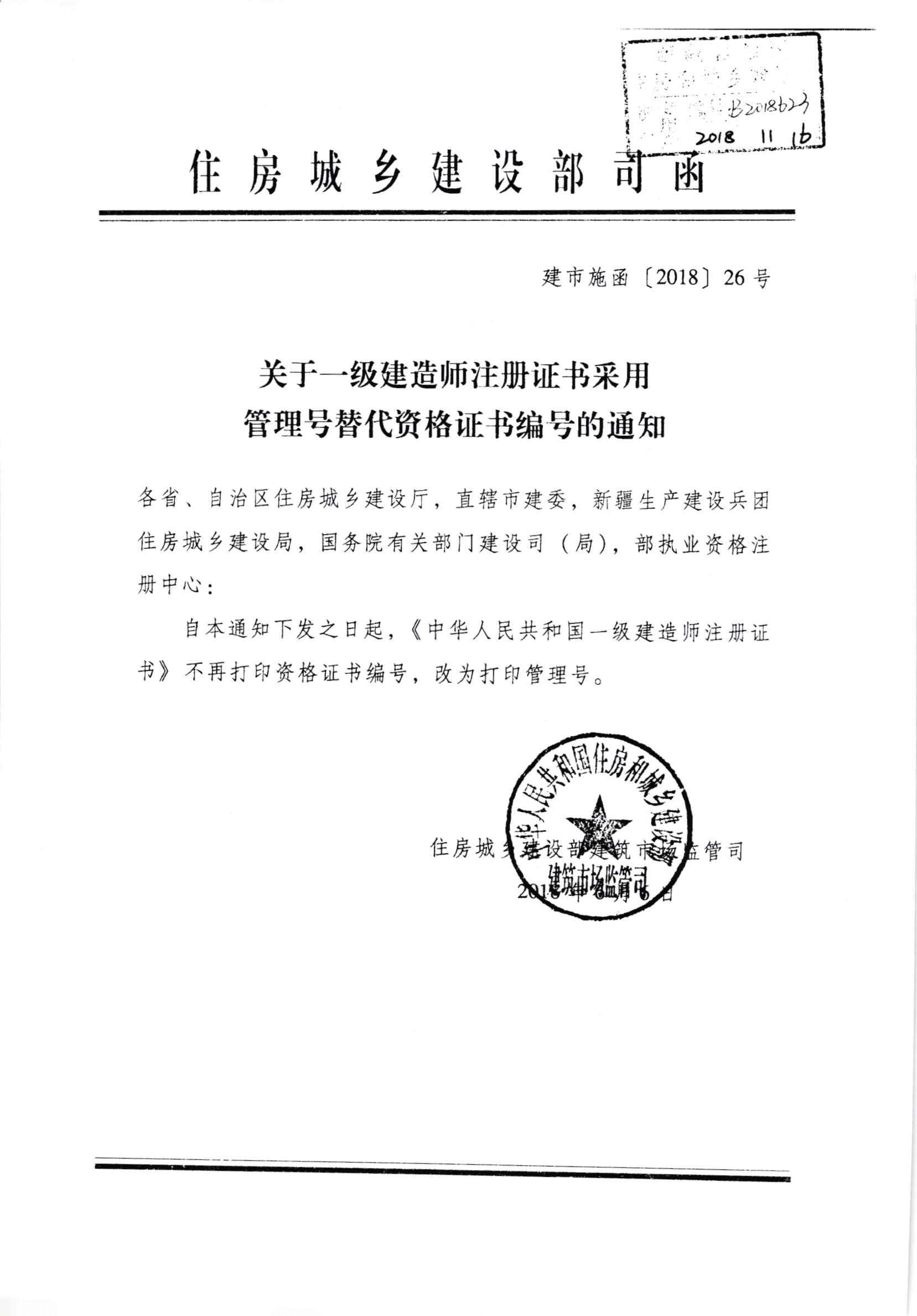 关于一级建造师注册证书采用管理号替代资格证书编号的通知